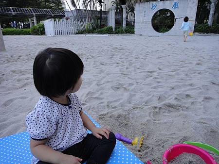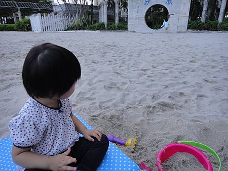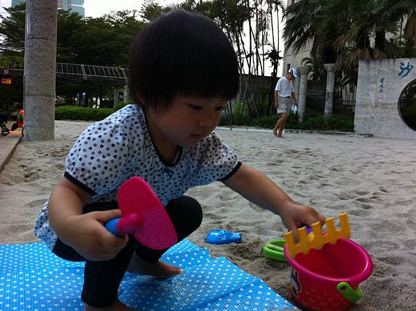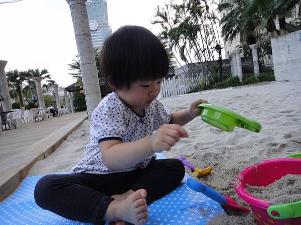第一次玩沙...芸芸還真的和大部分小小孩一樣...腳腳一點也不願意踏入沙地...
