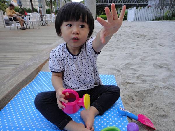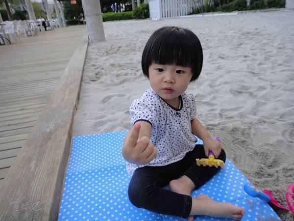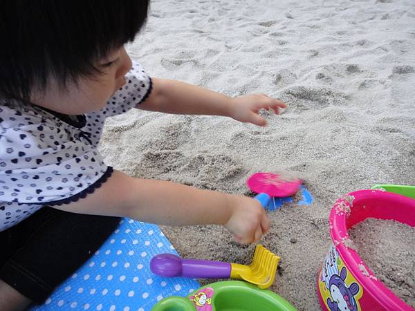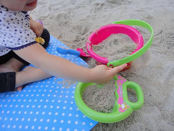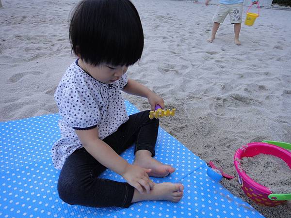還好我有帶海灘墊...雖然腳腳不肯踏入...但是她願意用手手摸摸看...