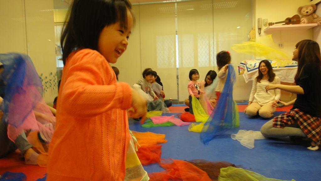 課程中...老師會搭配各種教具來陪孩子玩音樂...這是絲巾...
