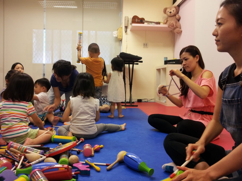 老師會倒出一大堆樂器...小朋友可以自己摸索自己玩音樂...