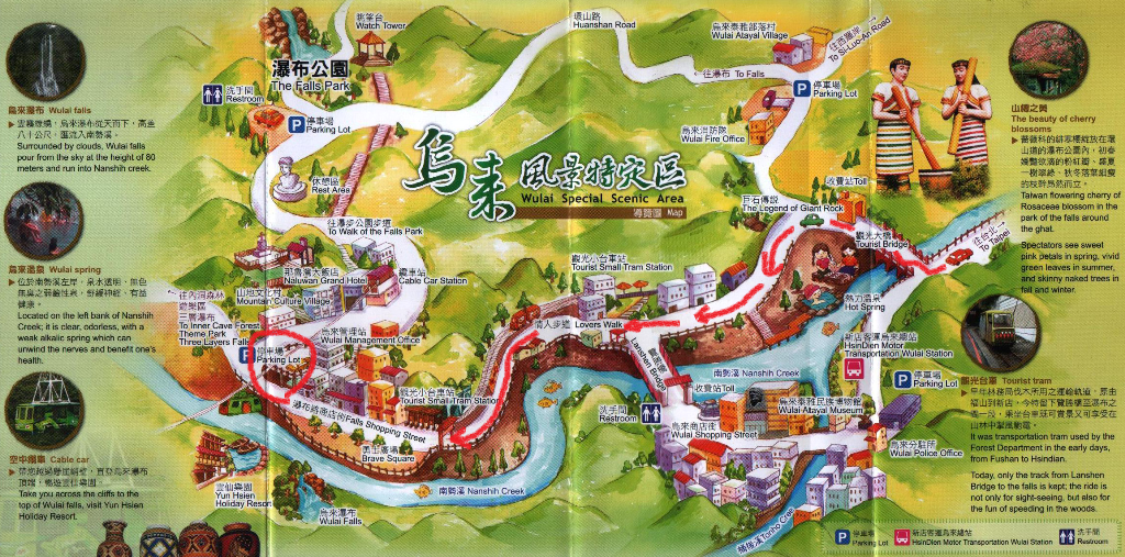 如果是步行進來的...可以從烏來老街=>攬勝大橋=>坐烏來台車(或步行.是上坡)=>(台車瀑布站)勇士廣場 .建議搭烏來台車上去...然後走路下來...