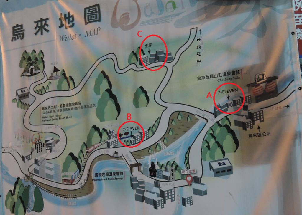 下圖是在老街入口拍到的地圖...因為它有標出便利商店...我覺得很清楚...位置A是"馥蘭朵烏來度假酒店"...