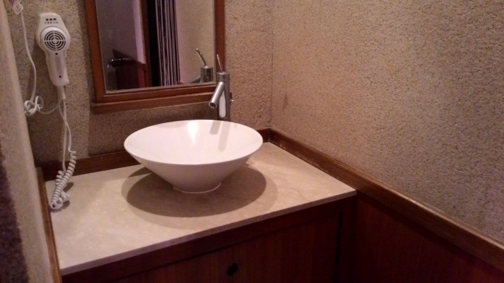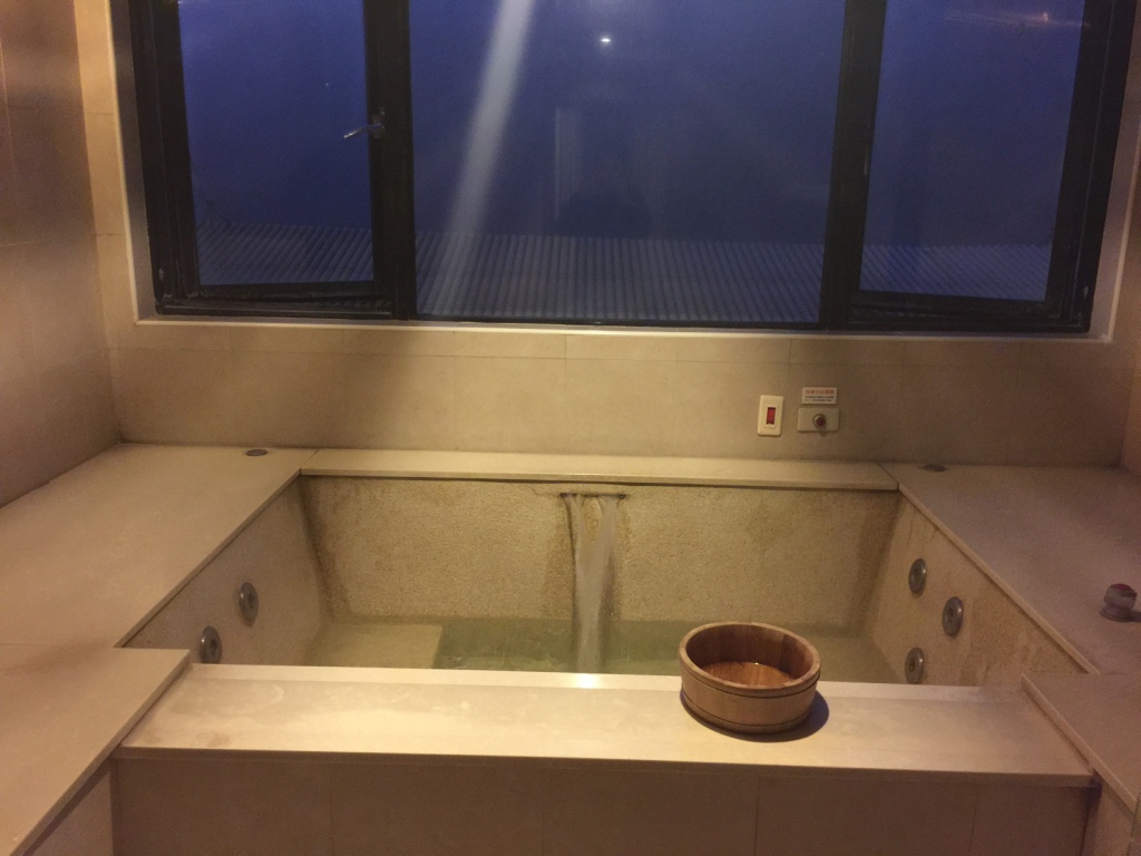 石砌的泡湯池...窗外原本應該是翠綠的山景...但是因為天色已暗...只能看到山區煙霧瀰漫...