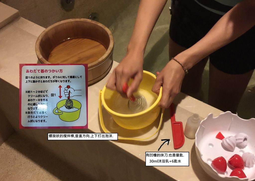 (1)30ml沐浴乳+6匙的水...然後用攪拌棒上下打出泡沫...