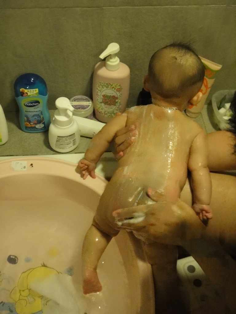 翻過來洗屁屁...哈...洗小嬰兒都要臂力驚人...