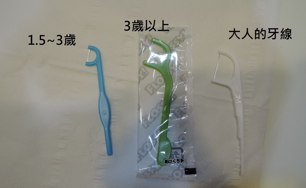 比較一下牙線的大小...3歲以上的只比大人的小一點點...但是設計的比較圓弧...適合小朋友拿取...