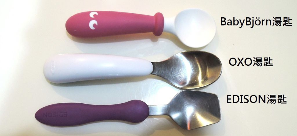 兩支手把處都是肥肥胖胖的(長度也差不多)...很適合幼兒抓握...OXO的是不銹鋼湯匙...不銹鋼材質是媽媽們最安心的材質...