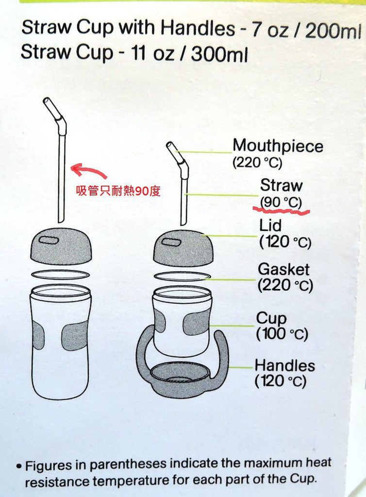 嗯嗯...請看各部位耐熱溫度...吸管只耐熱90度...不能入蒸氣消毒鍋...