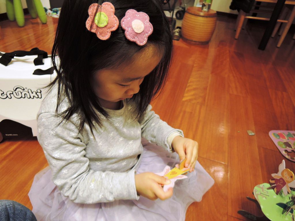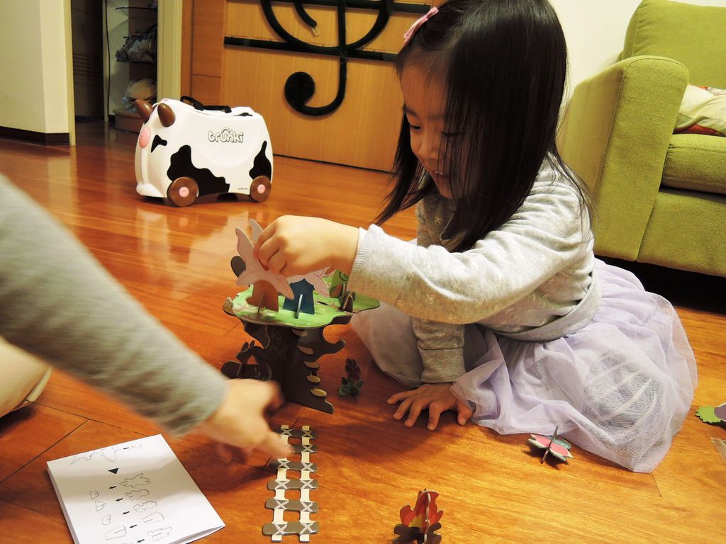 開始拼...兩塊拼圖以十字交叉互相"崁入"...(需要用力...芸芸沒辦法完整崁到最底...要大人幫忙...)