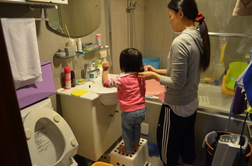 再來就是洗手囉...一定要有椅子可以爬上去...那個墊腳凳是在IKEA買的...
