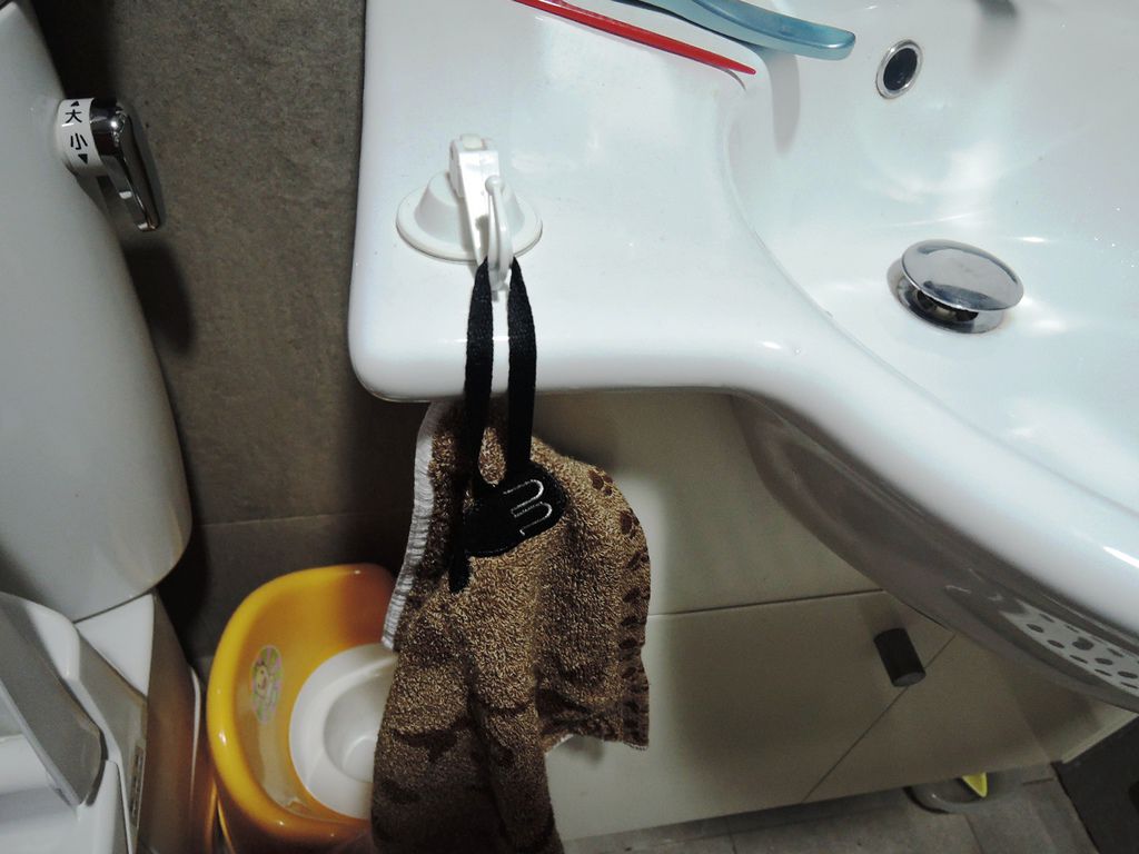 剛開始我實在找不到完美的地方掛擦手巾...後來我發現我可以在洗手台上吸一個"吸盤掛勾"...