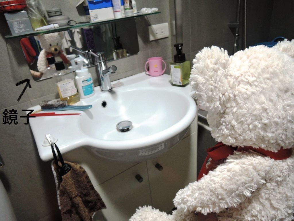 下圖我用一隻小熊代替芸芸...我在洗手台前方...貼了一片鏡子...這樣芸芸洗手刷牙也可以照到自己...
