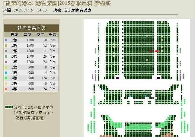 一樣來分享一下座位視野...出門前我上年代看一下售票狀況...深綠色都是售出...好位子幾乎賣光光...只有價位NT900的剩比較多空位...