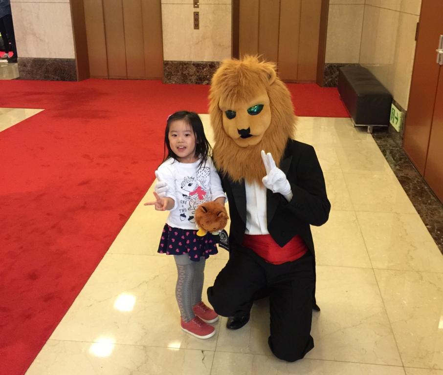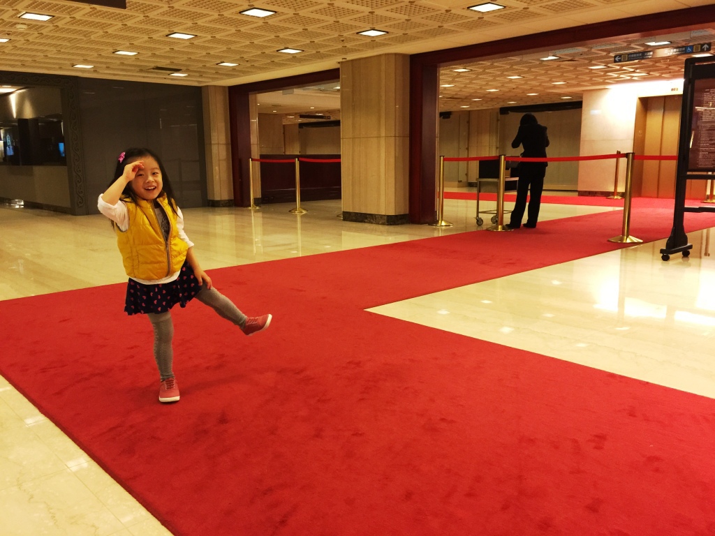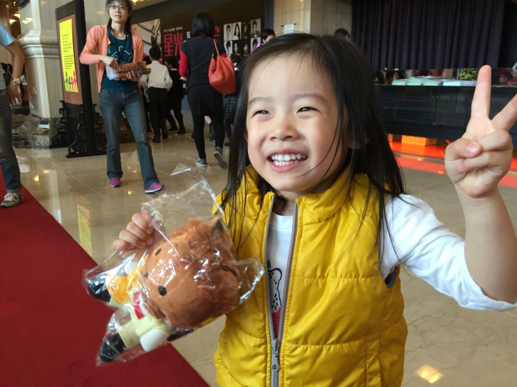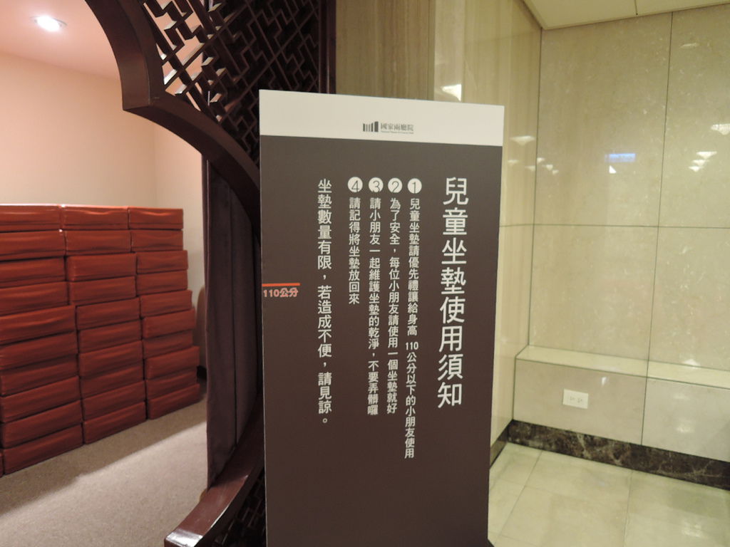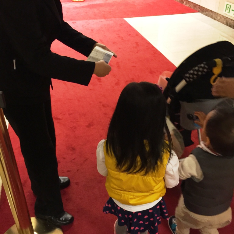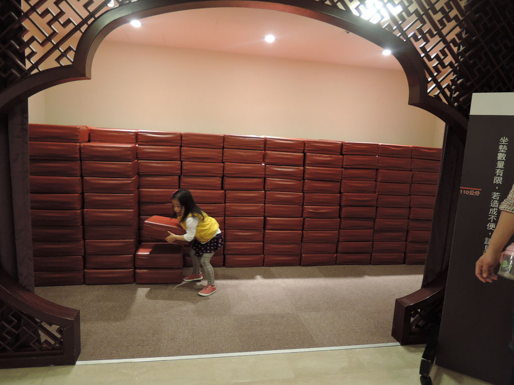 驗完票可以進入大廳...我們剛好經過可以拿增高墊的地方...所以讓芸芸去拿一個...