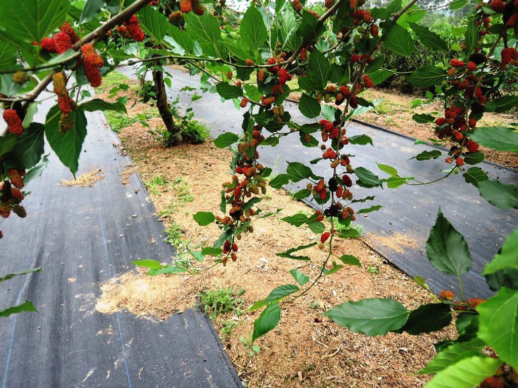 老闆種植的是改良品種的軟枝桑葚樹(垂柳桑)...紅黑相間果實纍纍的桑葚...就這樣把枝條拉垂下來...