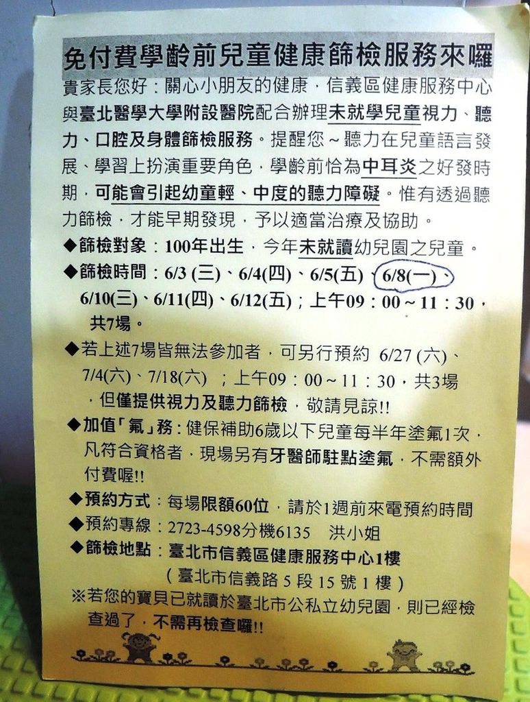 背面就是通知我們可以免費為還沒上學的芸芸作健康篩檢...