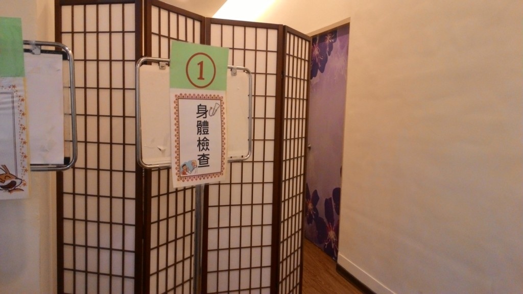這裡有用屏風圍住...因為會脫下尿布(或小褲褲)到大腿處...檢查一下身體...所以建議穿褲型尿布(或小褲褲)...