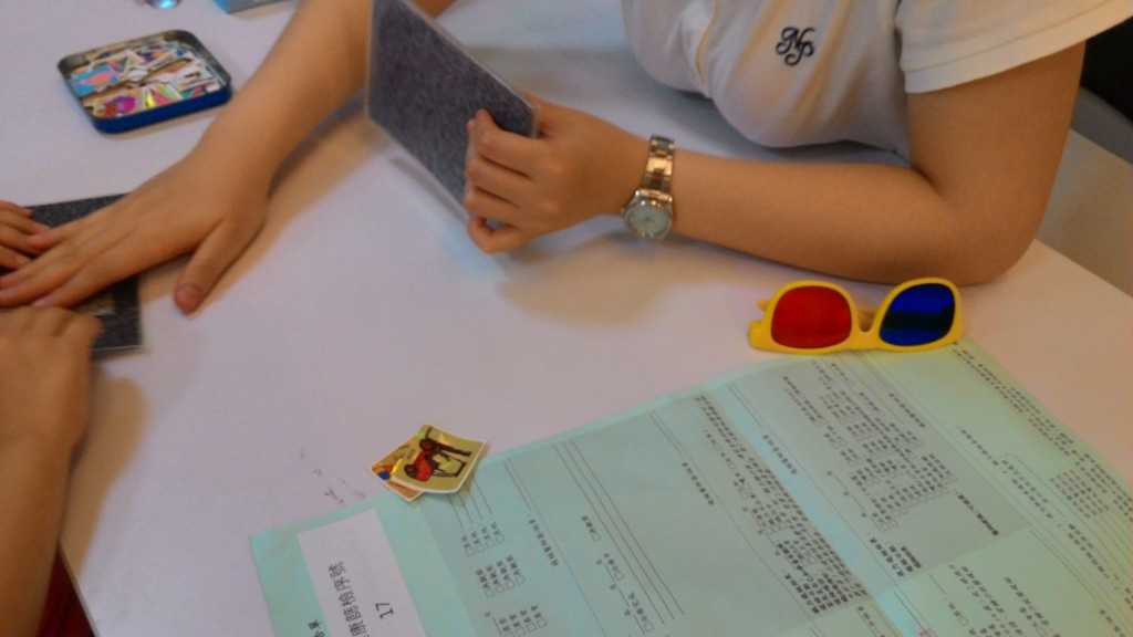 接著讓孩子戴上下圖中的[紅藍眼鏡]...這樣下圖工作人員手中的[隨機點立體圖卡],就會在戴上眼鏡後浮出形狀圖案~