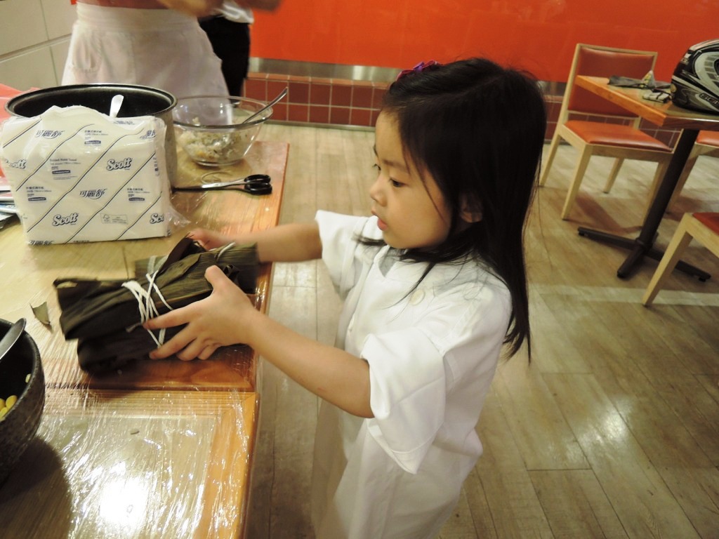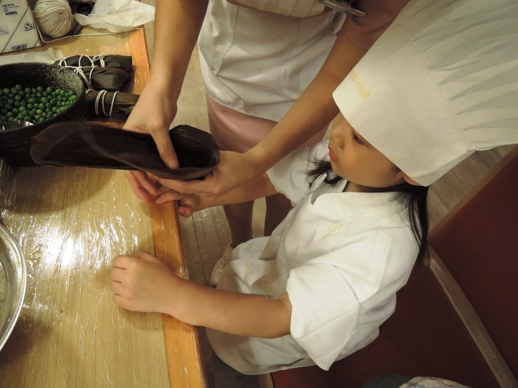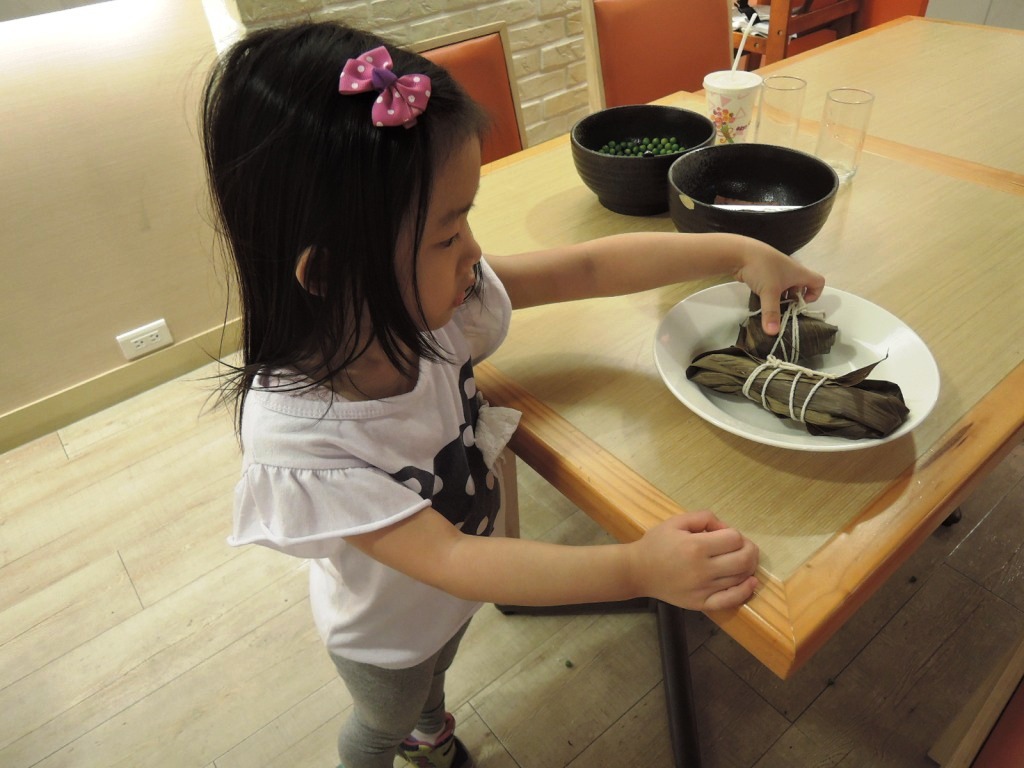 綁粽子...當然[打結]對芸芸來說是很困難的...所以還是要大人幫忙...(這樣就完成囉...)一共要包6個呢~