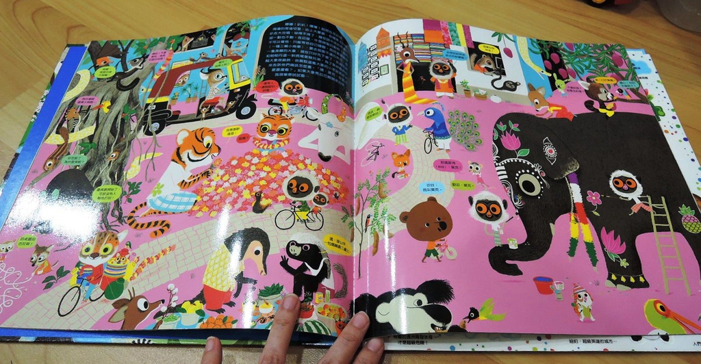 這本書並沒有一個主要的文字來[說故事]...而是像下圖一樣...每個角落都有對話在發生...小朋友在閱讀的時候...家長就是和孩子一起找尋圖案中的細節...