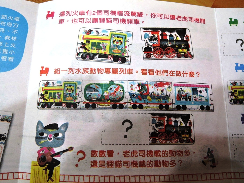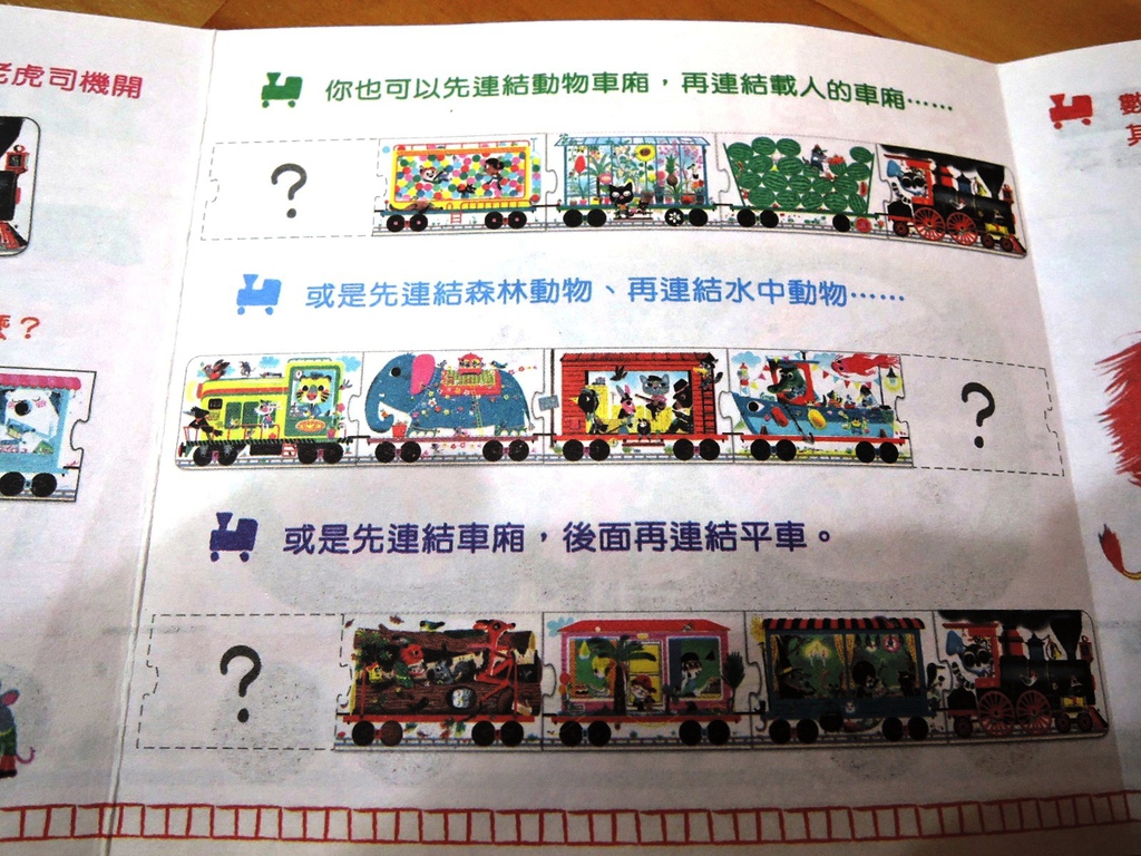玩法很特別...裡面很有多火車廂...各式各樣的動物要坐火車出去...孩子拼的時候...可以教孩子認識不同類型的動物...