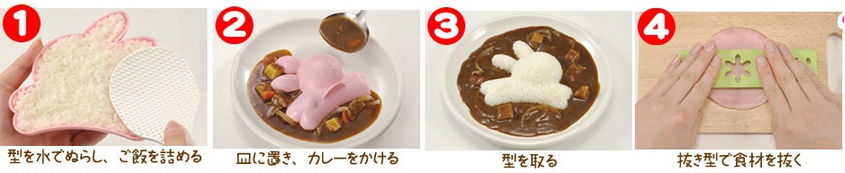 (1)先填飯壓出形狀(2)倒扣之後先加咖哩在四周(3)脫模.把模型拿起來(4)做裝飾用的食材
