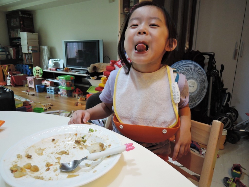 開始吃之前還是給芸圍上圍兜...