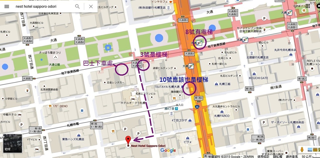 下圖是google地圖,我標出地鐵出口的相對位置,3號和10號出口都離飯店很近,但是8號才有電梯。