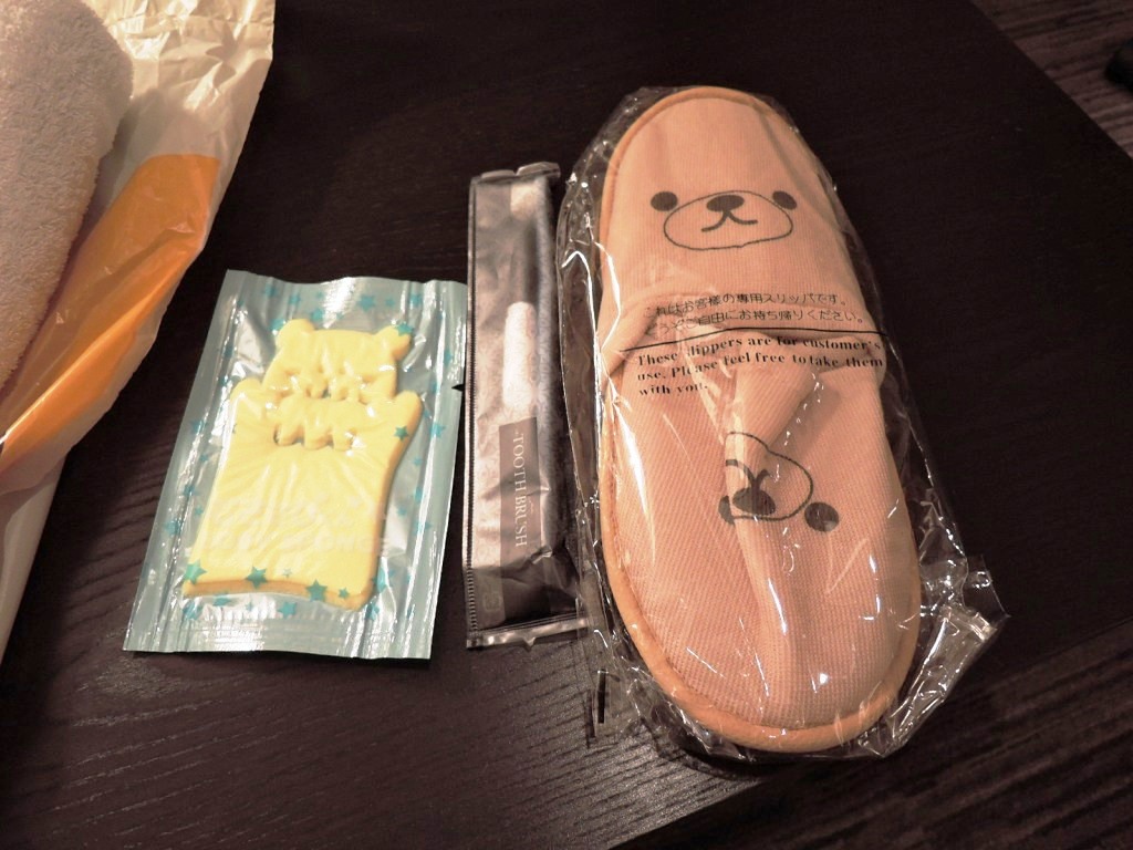 check in時,櫃檯人員給芸芸一份小孩專用的備品。滿可愛的,這雙小熊拖鞋,最後陪芸芸住完北海道的行程,還滿方便的。黃色小熊則是洗澡海綿,再加上一組小孩的牙刷。