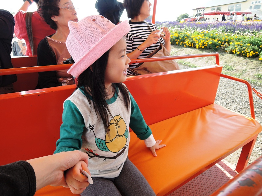 接著賞花去,這裡很大的特色,就是可以乘坐[拖拉機巴士]遊園。因為芸芸喜歡坐火車,所以就讓她體驗一下。車票價格是,高中以上日幣500/人,芸芸不用錢(小學以上日幣300)。