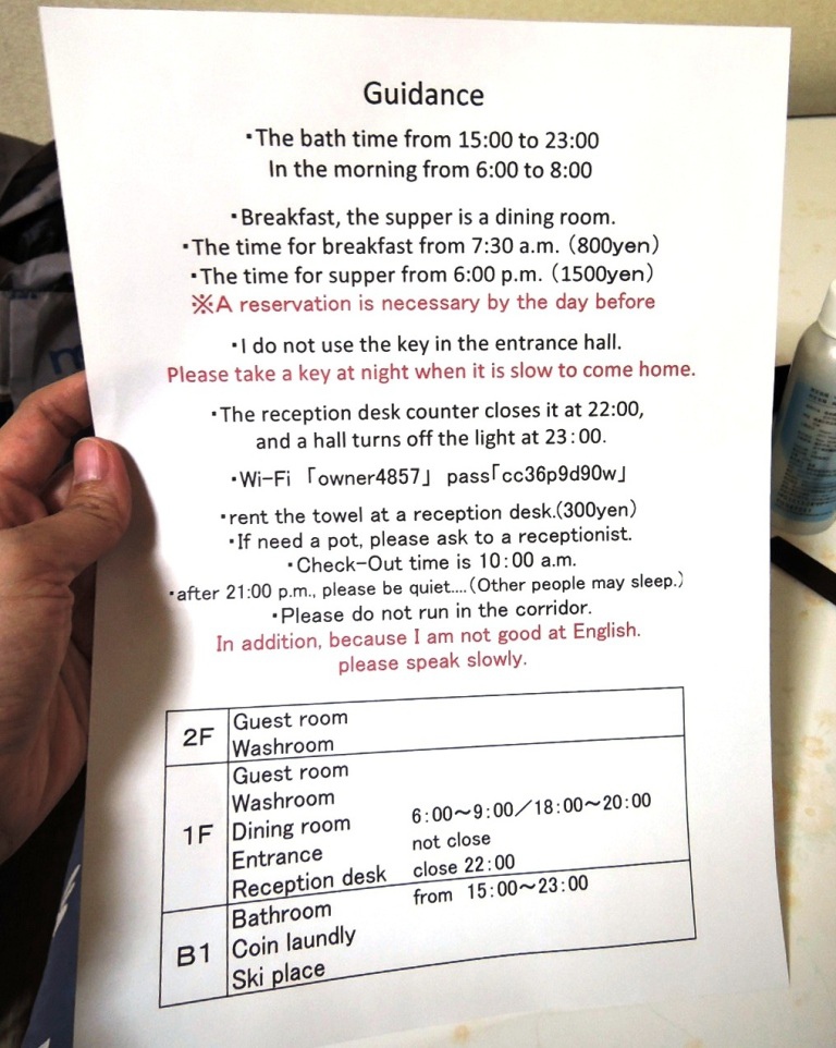 櫃檯人員的英文不太行,但是有提供英文的住宿規定給客人,所以還算安心。