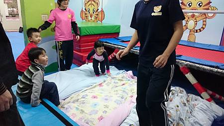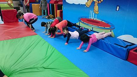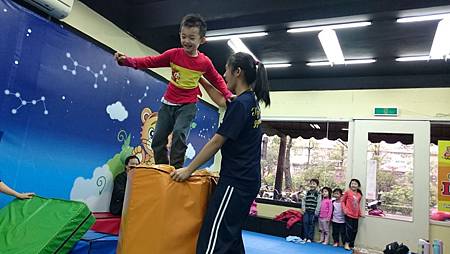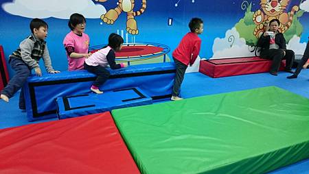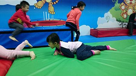 說真的,老師還滿有耐心的。但不知道是否是因為試上的關係(第一次上課),所以對動作的標準程度並不是非常要求,一整堂課下來,有非常多的動作變換。不過對芸芸來說,頻繁的換動作是比較好,因為芸芸耐心不太足夠,如果單一動作持續很多次,她會不太耐煩的說她不要作了。一堂課扎實的上足50分鐘,而且下課後,這些小人又跑回彈跳床那邊玩,還拉了這次沒接觸的單槓,老師居然都隨時陪在旁邊,完全沒有因為已經下課就放著不管。下面短短9秒的陪玩影片。這些小朋友至少又多玩了10多分鐘。