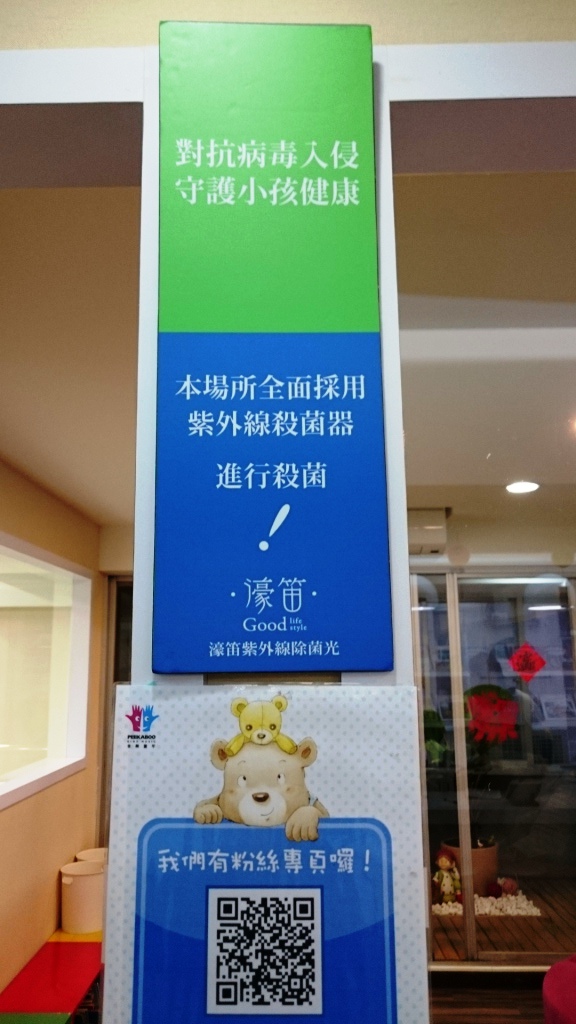 進來教室之前,櫃檯人員會馬上用酒精幫小朋友和大人的雙手消毒,而整個教室環境會在固定時間用紫外線消毒,所以感覺還滿安心的。