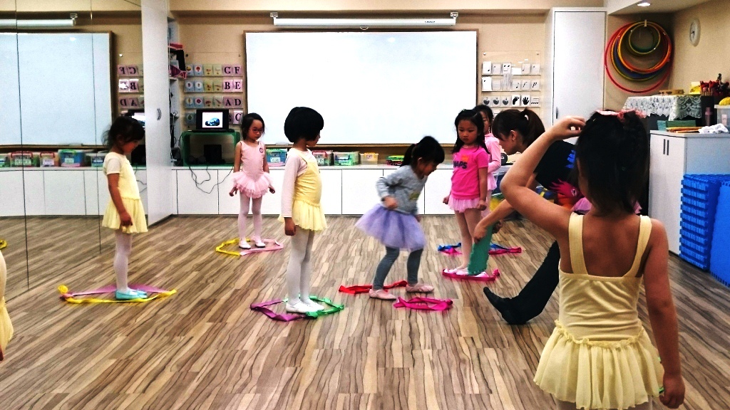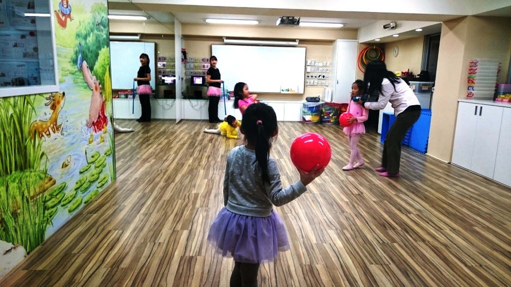 上課前小朋友們自己先在教室裡面玩球,也算是熱熱身,大家都穿著專門的舞衣和舞鞋。芸芸沒有舞衣,我只有刻意的找了一件很像舞衣的紫色澎裙給她穿。舞鞋則是櫃檯人員借給芸芸的。