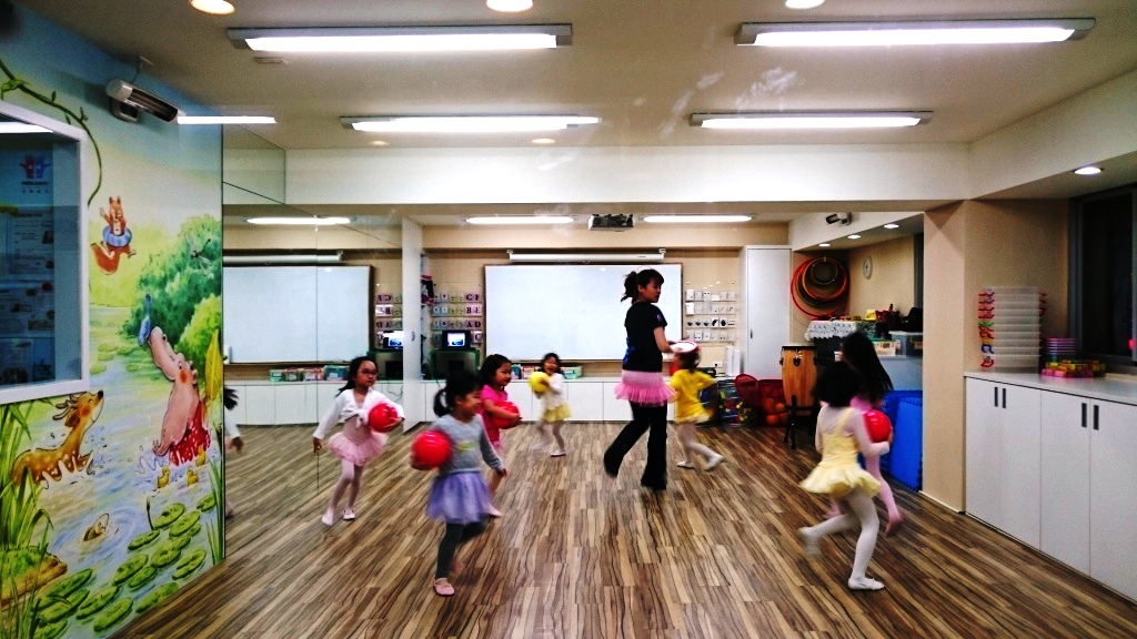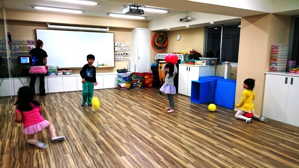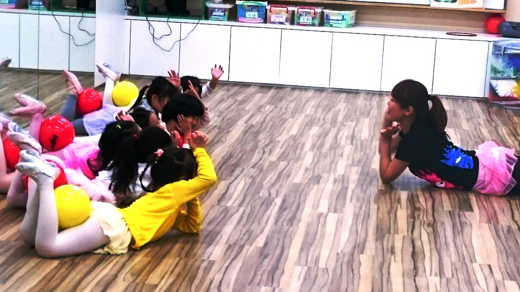 不能進去我好失落><,只能看見他們在做什麼,但是聽不見音樂和老師的聲音,而且只有一個角度,無辦法特別拍攝芸芸。這裡感覺像是在熱身,孩子們拿著球球繞圈跑。