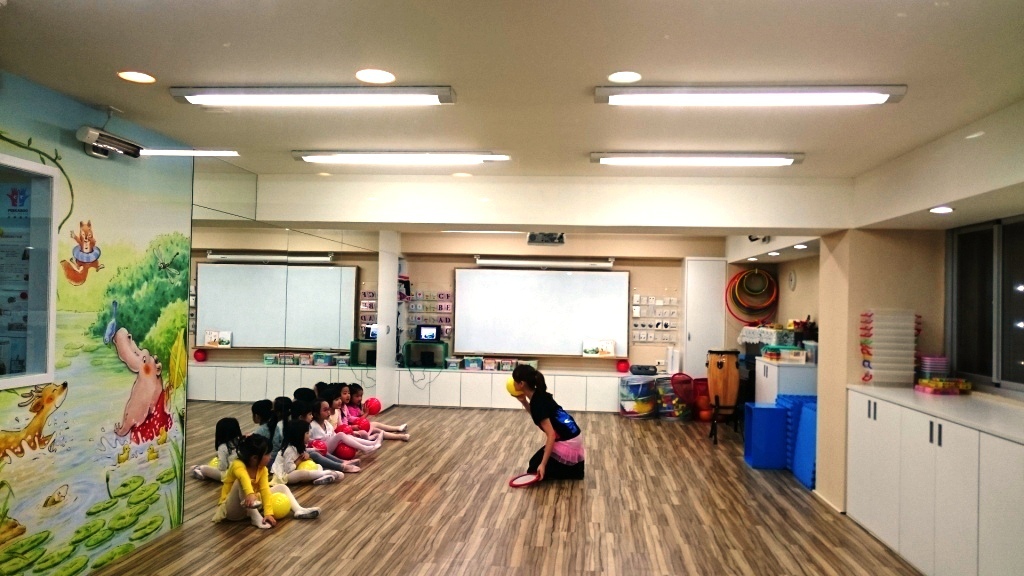 這是河馬教室(芸芸今天在這間上課),河馬教室最大間。教室後方都有大面玻璃,家長可以從外面看到孩子上課的情況。