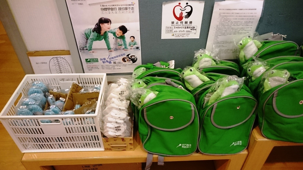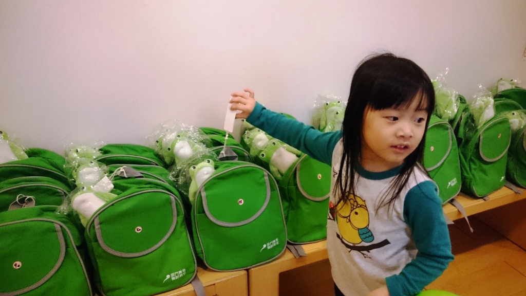 報名的話,除了需要學費之外,還有一筆教材費。教材費包含下圖這個書包,加上兩套制服(一套長袖、一套短袖),和一隻布卡蛙