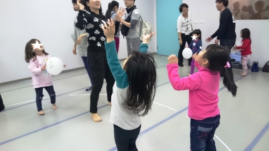 課程結束前5分鐘,家長們又可以進教室和孩子一起活動,小朋友們正在玩氣球。