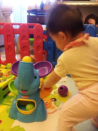這個玩具的玩法,就是把所附的5個球...放入大象的耳朵...再按下紅色音符按鈕...