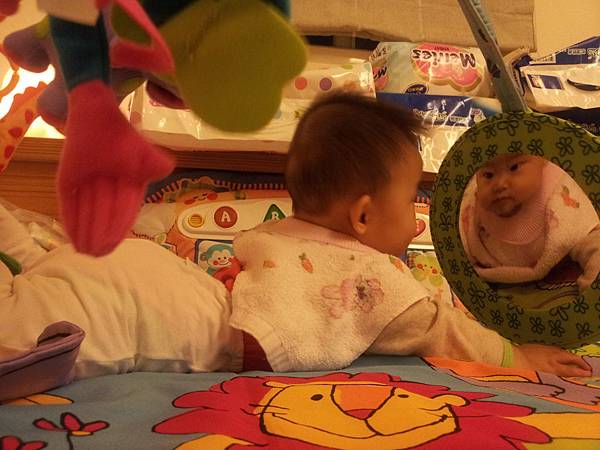 有時候還會對鏡子呀呀叫...這可以幫助他建立自我形象...甚至促進語言發展...