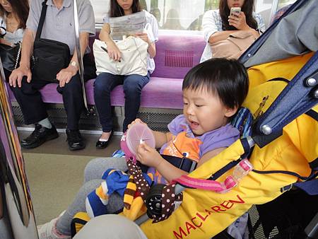 我們給她一盒零食盒...裡面裝米餅...他就會乖乖的坐在推車上...